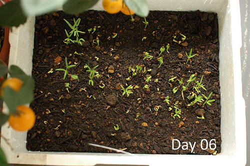 Cây đã bắt đầu nhú 2 lá mầm vào ngày thứ 5. Lúc này có thể di chuyển chậu cây ra chỗ có ánh nắng